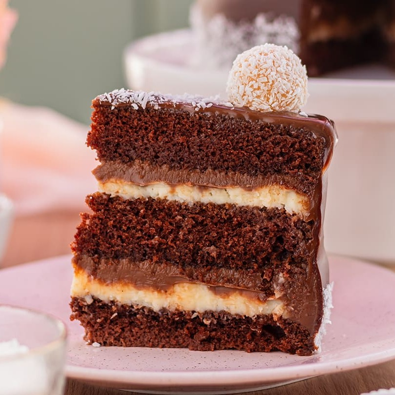 Massa de bolo de chocolate, recheio de brigadeiro ao leite e nosso maravilhoso recheio de coco, coberto com ganache de chocolate e bolinhas de beijinho.