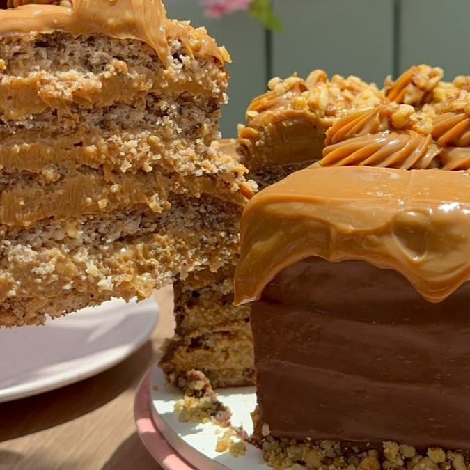 Deliciosa massa de bolo com nozes, recheada com doce de leite e coberto com ganache de chocolate meio amargo e decorado com doce de leite e nozes.