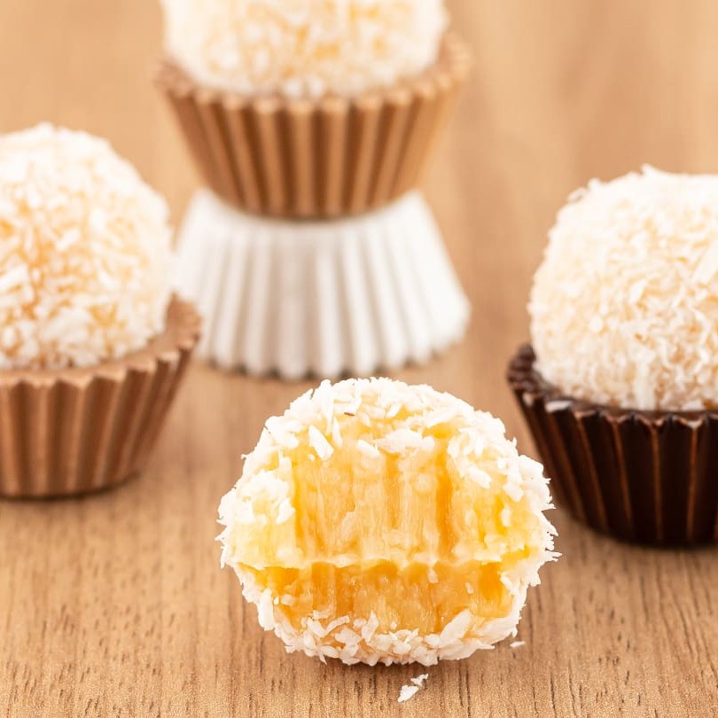 Classica massa de pão de ló, umedecida com calda a base de leite e recheada com abacaxis caramelizados e beijinho de coco. Empanado no coco ralado. Peso mínimo aproximado - 110g