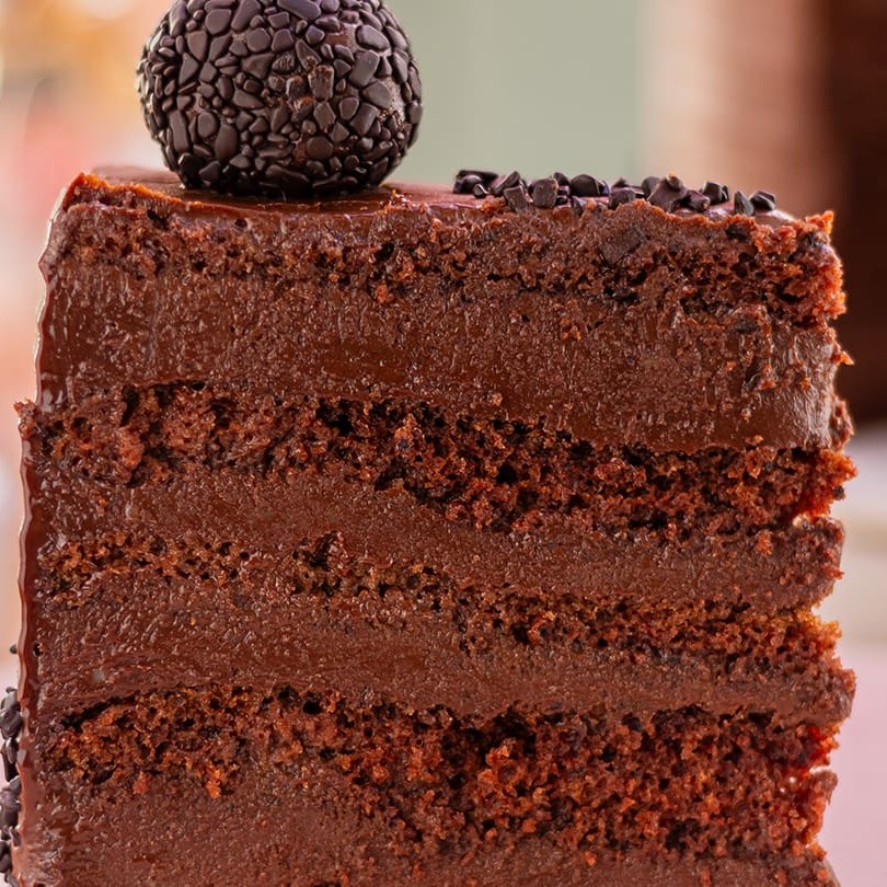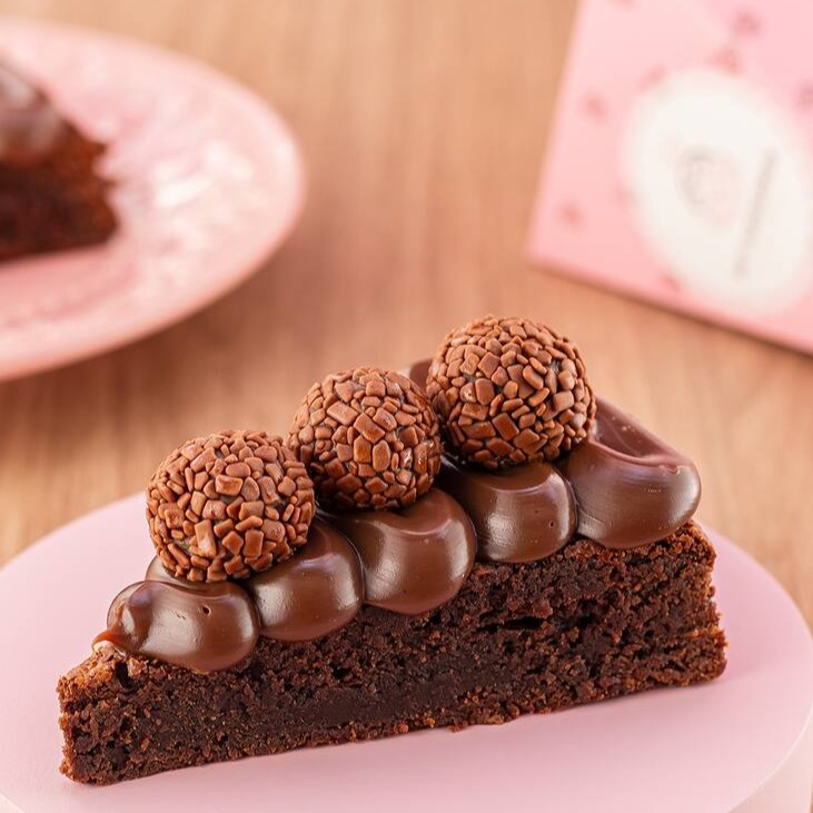Fatia de bolo com massa de chocolate, recheados com brigadeiro meio amargo e finalizados com chocolate 70% da callebaut.