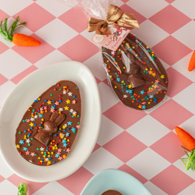 Tablete de 50 gr em formato de ovo de chocolate ao leite maciço com confeitos coloridos.