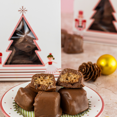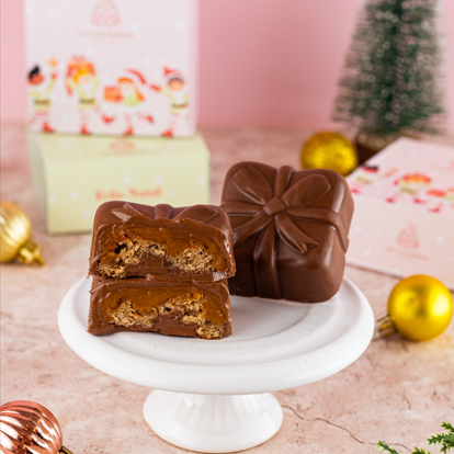 Deliciosa casquinha de chocolate belga, recheada com chocottone e doce de leite, na nossa caixinha personalizada de Natal. Um verdadeiro presente.