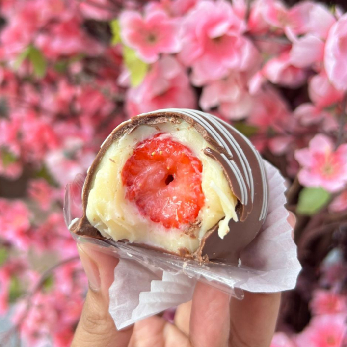 Delicioso morango enrolado no brigadeiro de leite ninho e banahdo em chocolate ao leite callebaut