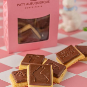 Delicioso biscoito amanteigado, coberto com tablete de chocolate ao leite, decorado com tema de Páscoa. - 110 gr