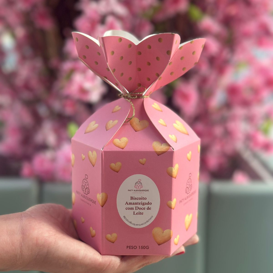 Saquinho com os nossos maravilhosos biscoitinhos amanteigados em formato de coração, recheados com doce de leite e cobertos com açúcar e canela. obs1: Produto de consumo imediato. obs2: Não é possível alterar nenhum produto, retirar ou adicionar ingredientes. obs3: Os produtos podem ir com vencimento para o mesmo Dia.