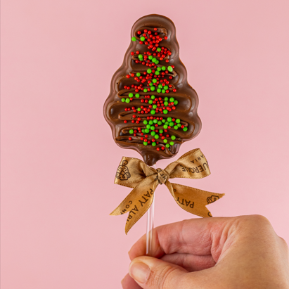 Pirulito de chocolate belga ao leite decorado com dragee natalino.