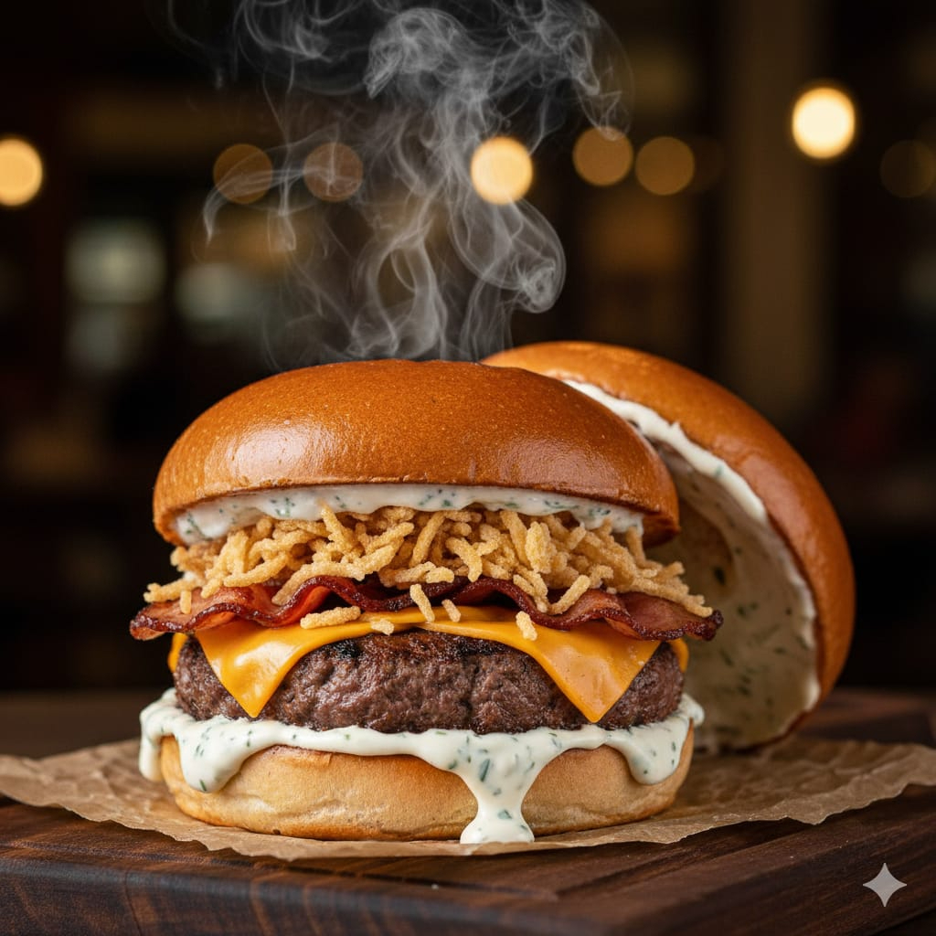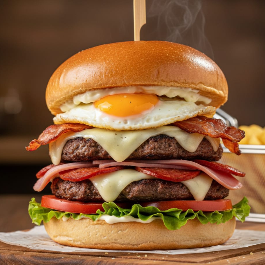 Pão Brioche, 2 Hambúrgueres Artesanais 180g, Queijo Cheddar, Bacon, Ovo, Cebola Crispy, Alface, Tomate e Maionese Especial