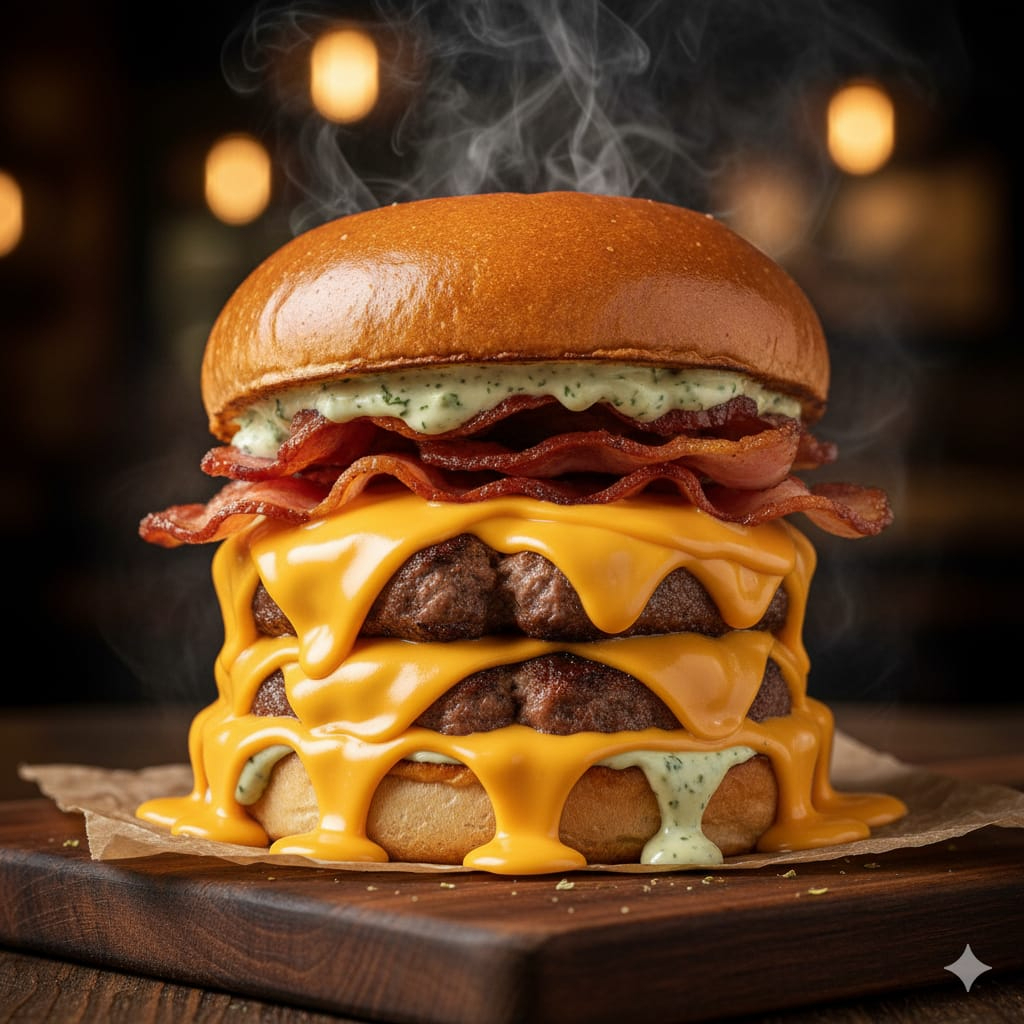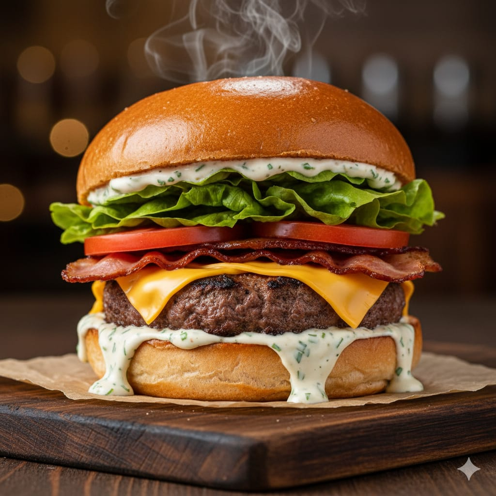 Pão Brioche, 2 Hambúrgueres Artesanais 180g, Queijo Cheddar, Bacon e Maionese Especial