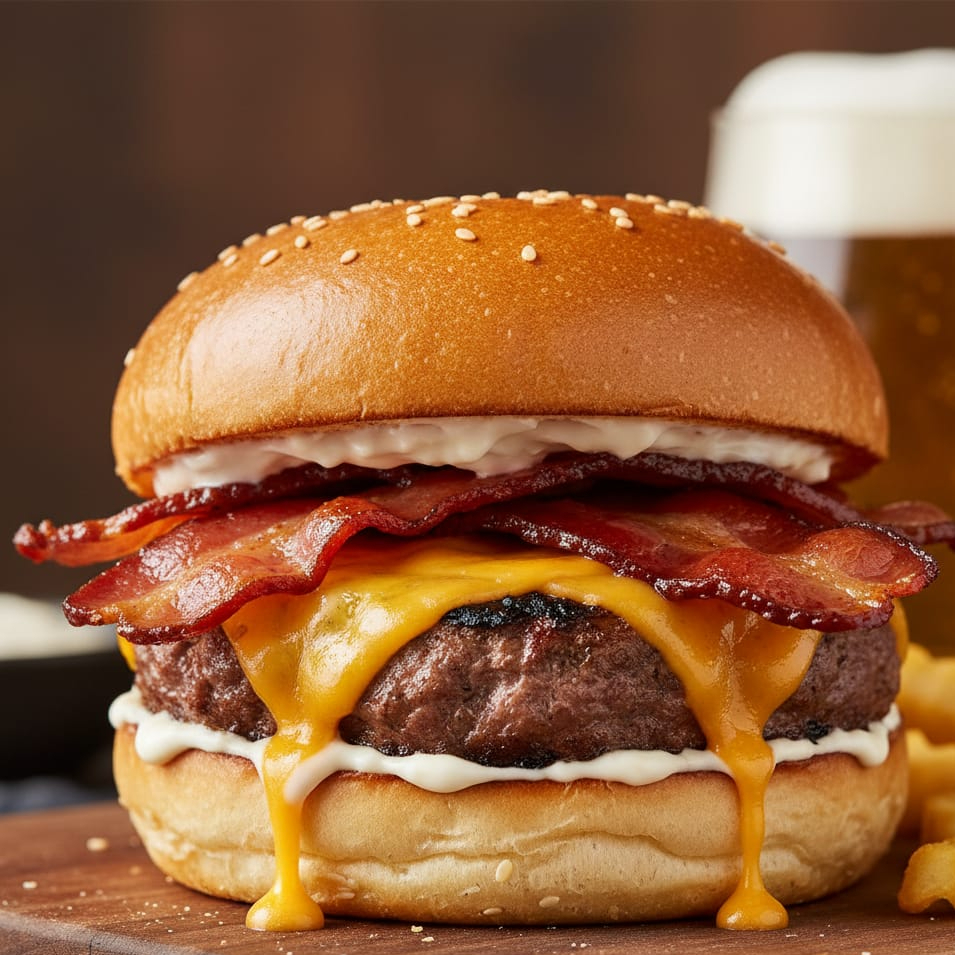 Pão Brioche, 1 Hambúrguer Artesanal 180g, Queijo Cheddar, Bacon, Cebola Crispy e Maionese Especial