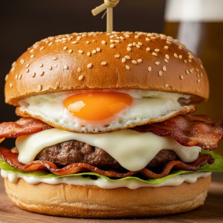 1 Pão de Hambúrguer, 1 Hambúrguer de 90g, Queijo Mussarela, Ovo, Bacon e Maionese