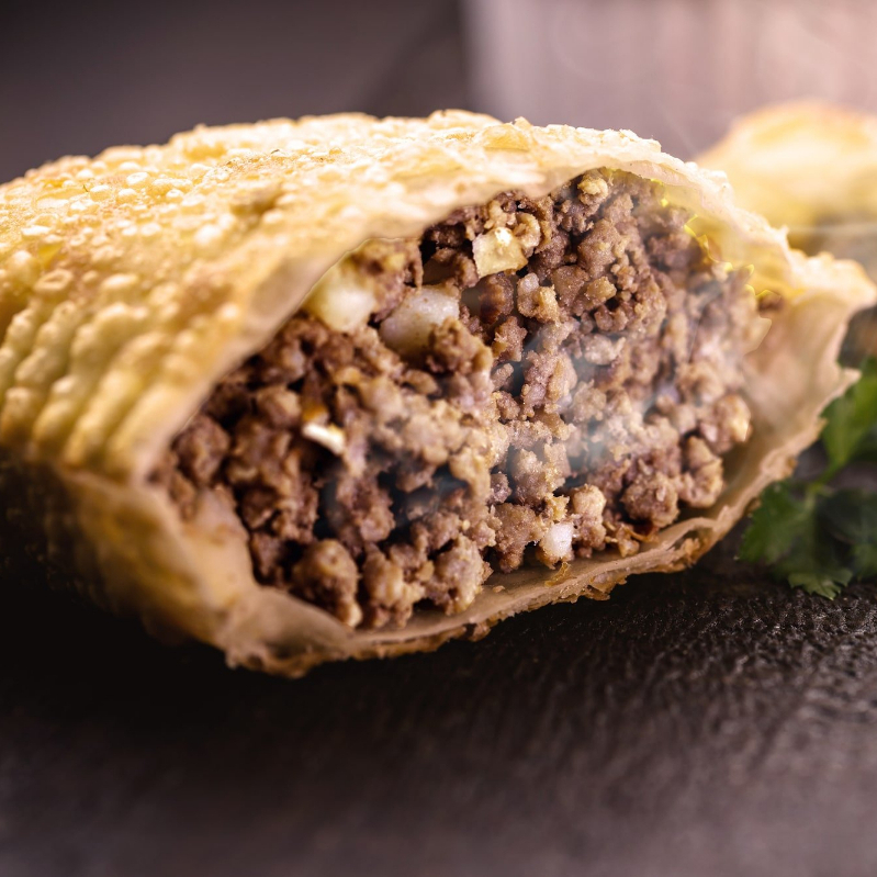 Pastel recheado com carne moída temperada e suculenta, frito até ficar crocante.