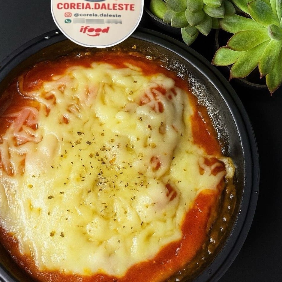 Para os apaixonados por queijo: topokki picante e saboroso, com aquela camada generosa de queijo derretido que puxa no garfo. Serve 1 pessoa.