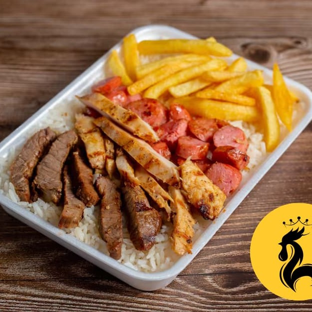Acompanha arroz branco soltinho, feijão e fritas, junto com um churrasco misto (Carne, frango e linguiça)