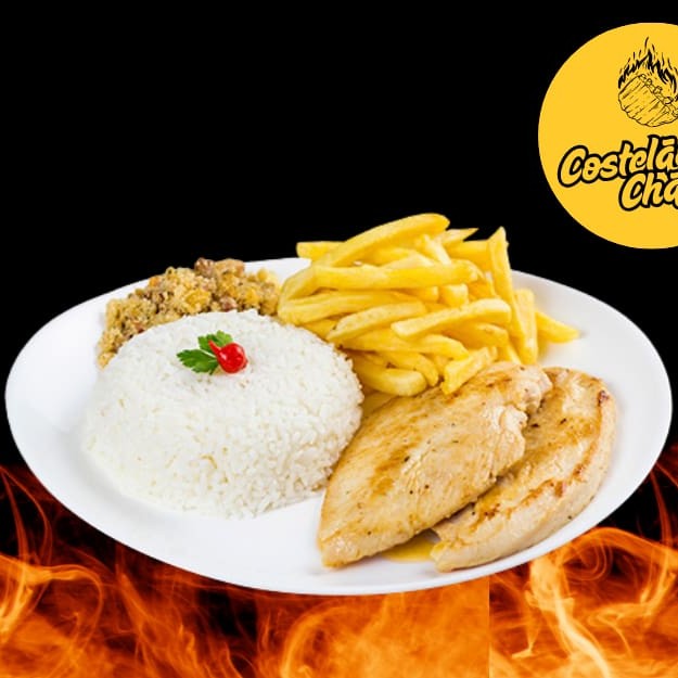 "Apresentamos o 'Frango Grelhado"". File de peito grelhado com arroz, feijão, batata frita e farofa crocante."