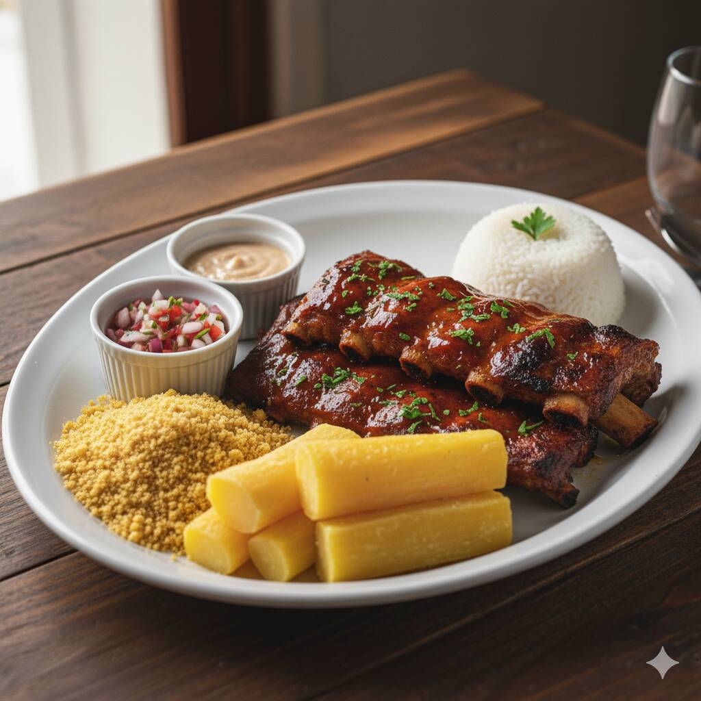 Desfrute do sabor inconfundível da nossa costelinha suína, assada com maestria no Bafo até o ponto perfeito de maciez e suculência. Um prato completo, repleto de sabor e ideal para quem ama um bom churrasco! Seu prato é cuidadosamente preparado com: Costelinha Suína no Bafo: 300g de costelinha suína macia e saborosa. Arroz Branco: 250g de arroz soltinho. Creme de Alho Caseiro: 200g do nosso delicioso creme. Mandioca Cozida: 300g de mandioca que derrete na boca. Farofa: 80g de farofa crocante e temperada. Vinagrete Fresco: 200g de vinagrete para acompanhar. Observação: Imagem meramente ilustrativa.