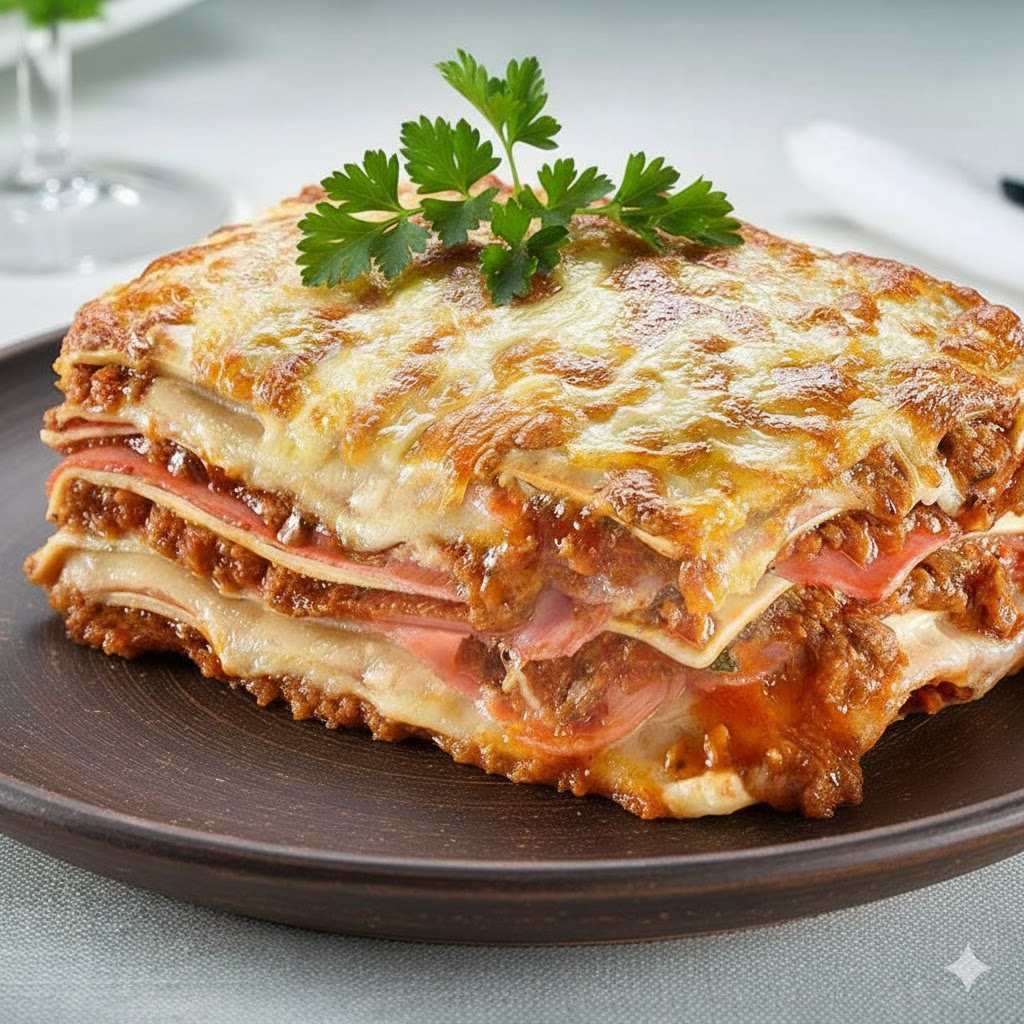 A melhor lasanha que você vai provar! Perfeita para dividir com a família ou amigos. • Ingredientes: Camadas de massa fresca, recheadas com um saboroso e tradicional molho à bolonhesa, presunto e generosas fatias de queijo muçarela derretido. • Cobertura Especial: Finalizada com nosso cremoso e suave molho Bechamel, garantindo uma textura irresistível. • Peso Aproximado: 1kg • Rendimento: Serve confortavelmente 3 a 4 pessoas.