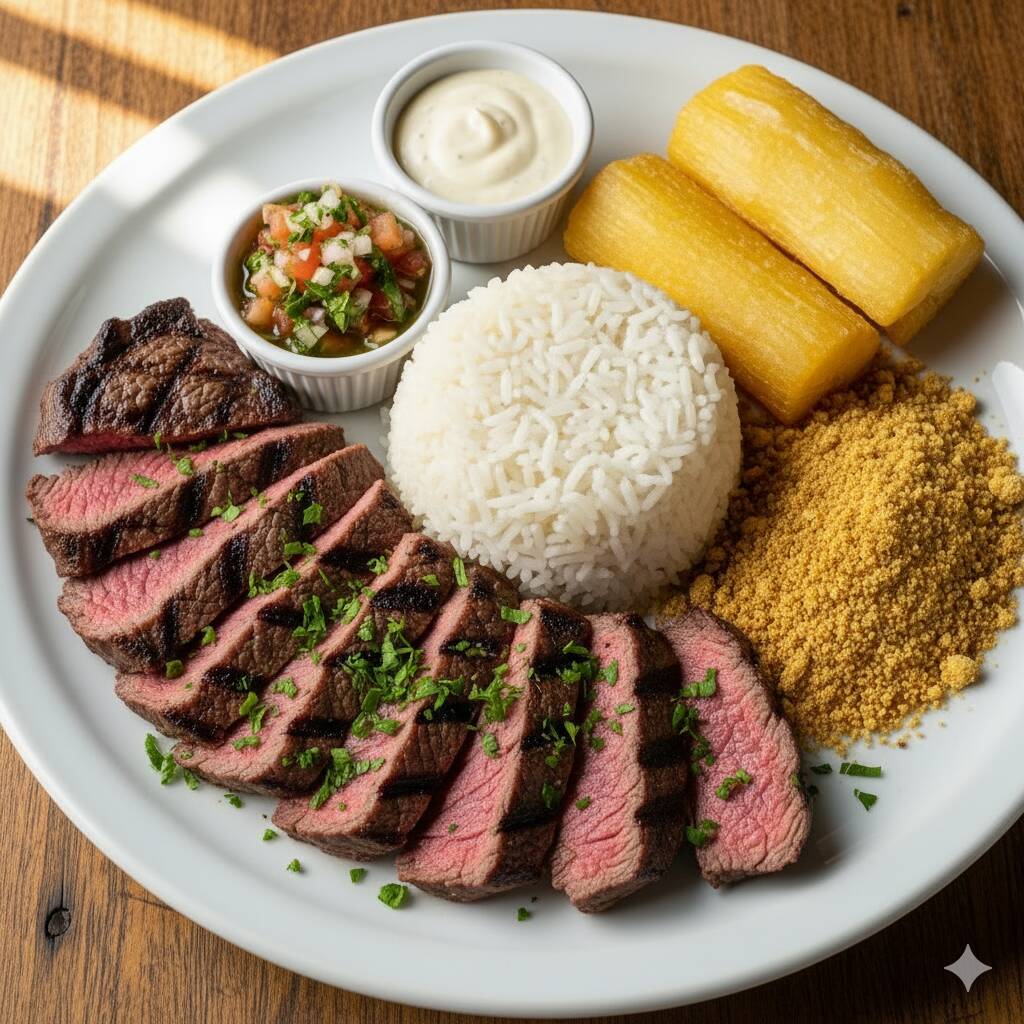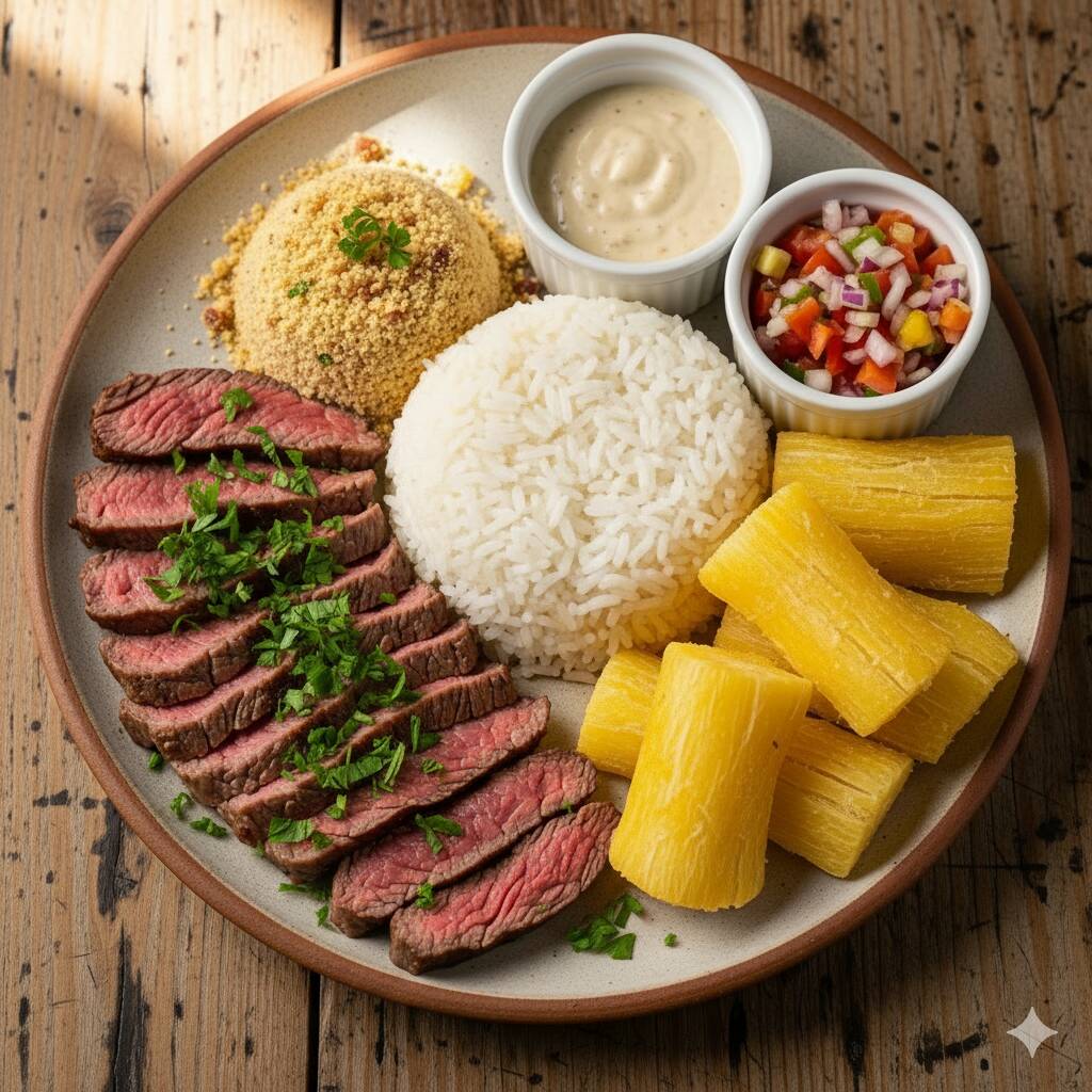 Delicie-se com nosso prato de Alcatra na Brasa, suculento e saboroso. Uma refeição completa e no ponto ideal, feita para os amantes de um bom churrasco. Seu prato inclui: 300g de Alcatra grelhada na brasa. 250g de Arroz Branco soltinho. 200g de Vinagrete fresco. 200g de Creme de Alho caseiro. 300g de Mandioca macia e saborosa. 80g de Farofa crocante. Observação: Imagem meramente ilustrativa.