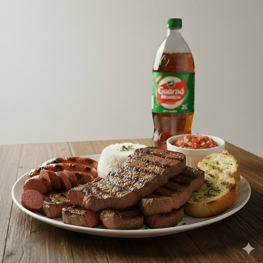 Prepare-se para o combo perfeito! Combinamos a suculência da alcatra com o sabor inconfundível da linguiça, tudo grelhado na brasa para uma experiência de churrasco completa no seu prato. Seu combo inclui: 300g de Alcatra 200g de Linguiça 250g de Arroz Branco 150ml de Vinagrete, 80g de farofa e 1 Guaraná Antártica bem gelado . Observação: Imagem meramente ilustrativa.