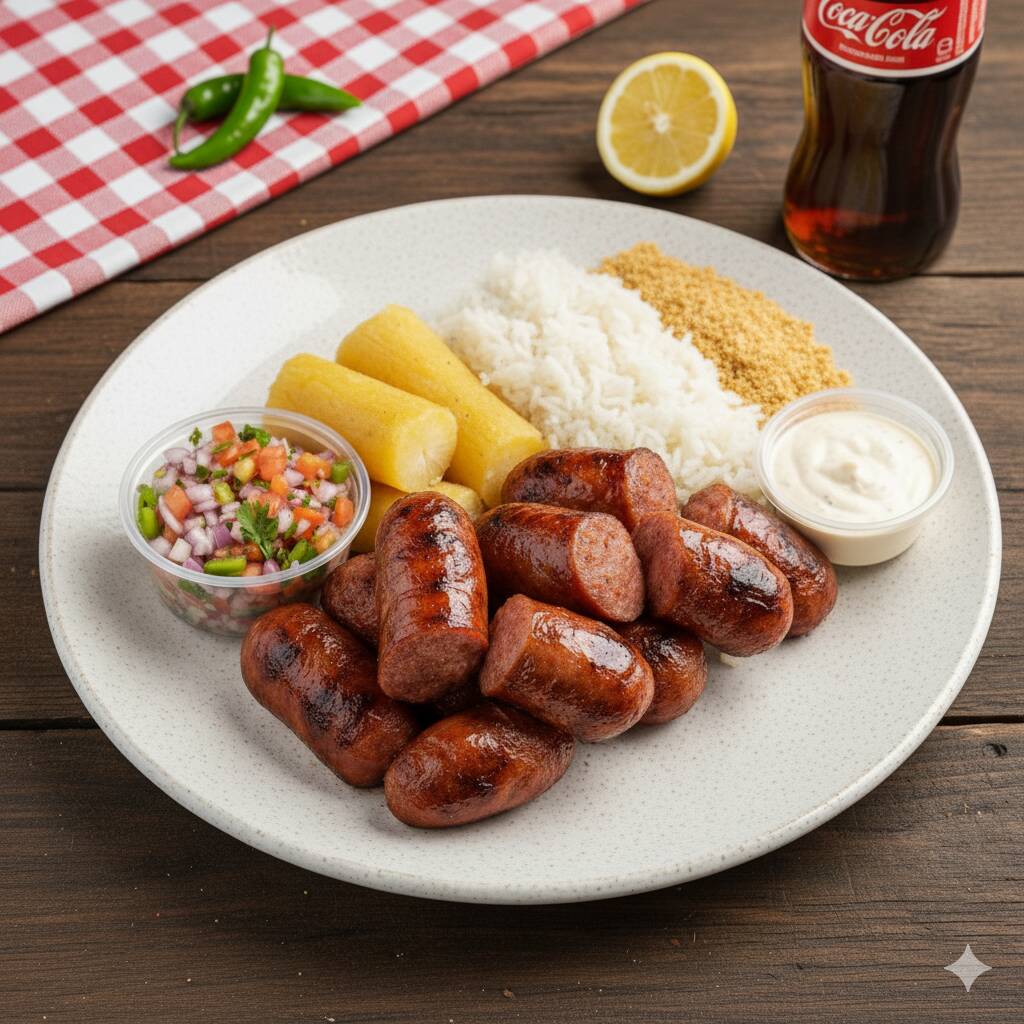 O sabor autêntico do churrasco no seu prato! Uma refeição completa e deliciosa, com linguiça suculenta grelhada na brasa e acompanhamentos clássicos. Seu prato é cuidadosamente montado com: Linguiça Grelhada: Generosos 300g de linguiça. Arroz Branco: 250g de arroz soltinho. Mandioca Cozida: 300g de mandioca macia. Vinagrete: 200g de vinagrete fresco e saboroso. Creme de Alho: 200g de um irresistível creme de alho caseiro. Farofa: 80g de farofa crocante. Observação: Imagem meramente ilustrativa.
