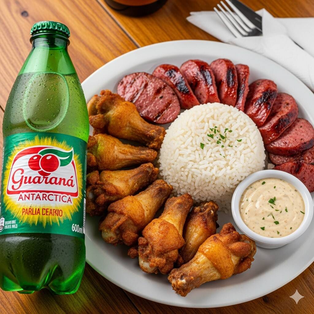 300g-Coxinha da asa de frango grelhada,200g- linguiça suculenta ,250g- arroz branco soltinho – 100g creme de alho cremoso – 80g farofa crocante e 1 Guaraná 600ml bem gelado totalmente grátis. Uma refeição completa, saborosa e perfeita para matar a fome com muito sabor!