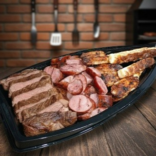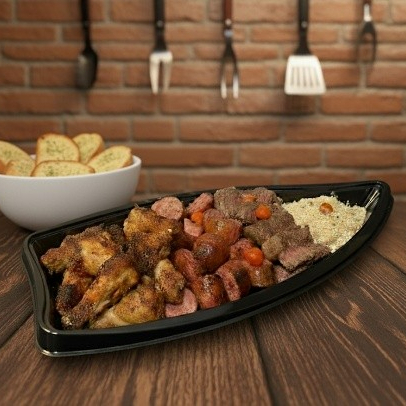 A 'Barca Tradicional com Alcatra, é uma celebração de sabor e qualidade. Este prato é uma combinação de carnes selecionadas e grelhadas à perfeição, oferecendo um banquete requintado de 1kg aproximado. Com 400g de Alcatra suculenta, 350g de Linguiça de sabor robusto, 200g de Coxinha da Asa, tão deliciosas que derretem na boca, 1 Pão de Alho (aprox. 80gr)crocante e 80g de Farofa para completar o prato. É a