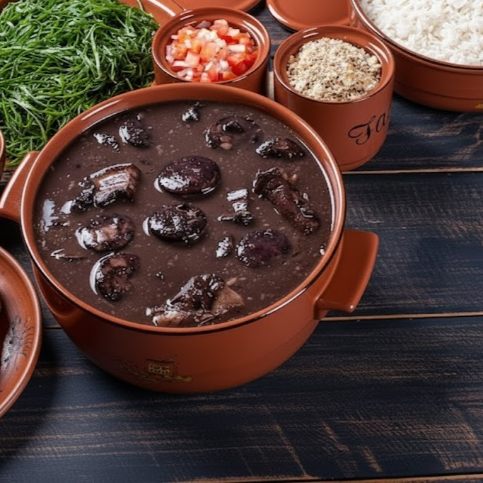 Sua refeição completa! 1kg de Feijoada (Feijão Preto, Costelinha, Carne Seca, Lombo, Paio, Calabresa, Bacon) com Todas as guarnições inclusas. Acompanha: 500g de Arroz, Couve, Vinagrete, Molho de Pimenta e farofa : Acompanha Uma Bisteca Grelhada Na Brasa. Peça agora e se delicie!