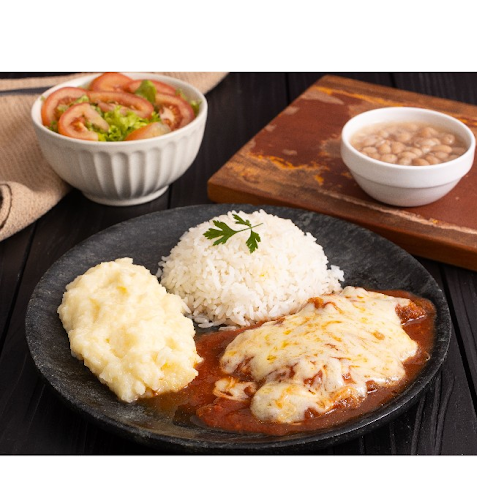Delicioso frango empanado com muita mussarela derretida e molho ao sugo, acompanha arroz branquinho, feijão bem temperado, purê de batata ou batatas fritas, acompanha também salada de alface, tomate e cebola.