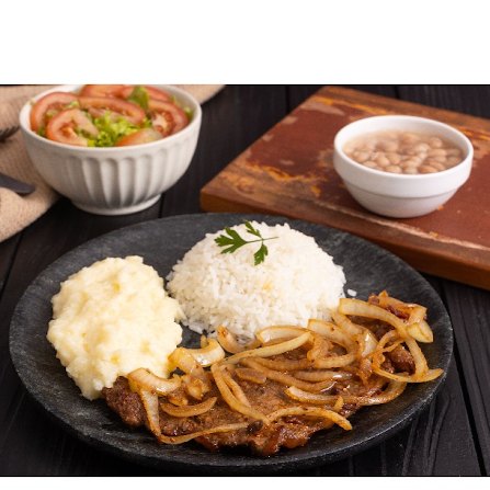 Deliciosa carne bovina de Contra Filé acebolada, acompanha arroz branquinho, feijão bem temperado, purê de batata ou batatas fritas, acompanha também salada de alface, tomate e cebola.