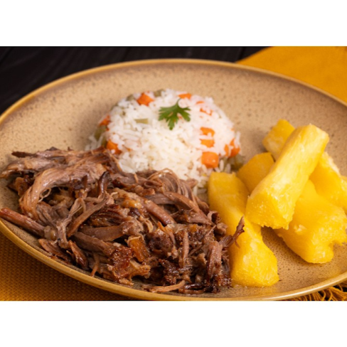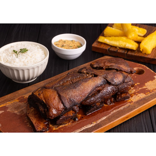 Suculenta costela feita lentamente no bafo por mais de 8hrs, acompanhado por arroz a grega e mandioca na manteiga.