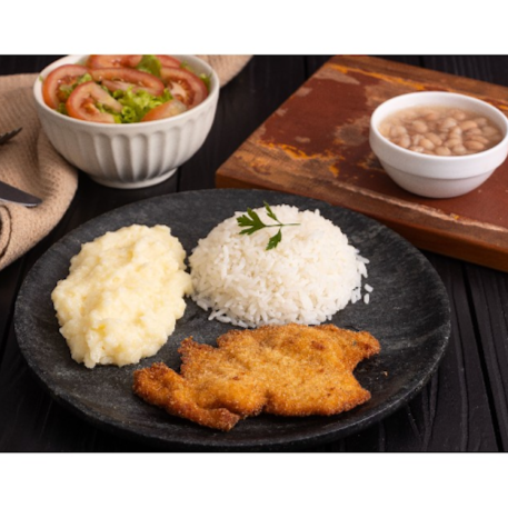 Delicioso filé de frango empanado na farinha panko, acompanha arroz branquinho, feijão bem temperado, purê de batata e salada de alface, tomate e cebola.