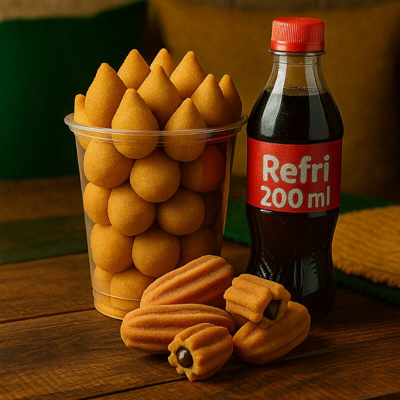 Este combo é composto por 50 mini salgados sortidos (aproximadamente 8g cada), servidos em um copo, que incluem: coxinha de frango, bolinha de queijo, kibe, croquete de calabresa e risole de presunto e queijo. Acompanha ainda 5 unidades de churros, recheados com doce de leite ou chocolate. Para completar, um refrescante refri de 200 ml.