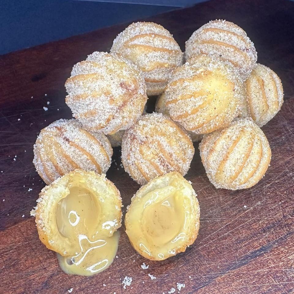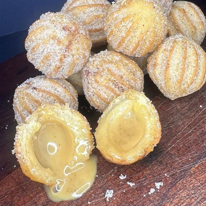 40 Unidades de mini churros recheado com doce de leite, empanado no açúcar com canela em pô.