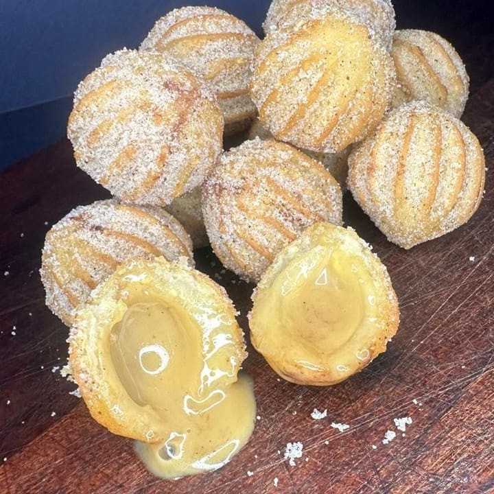 15 Unidades de mini churros recheado com doce de leite, empanado no açúcar com canela em pô.