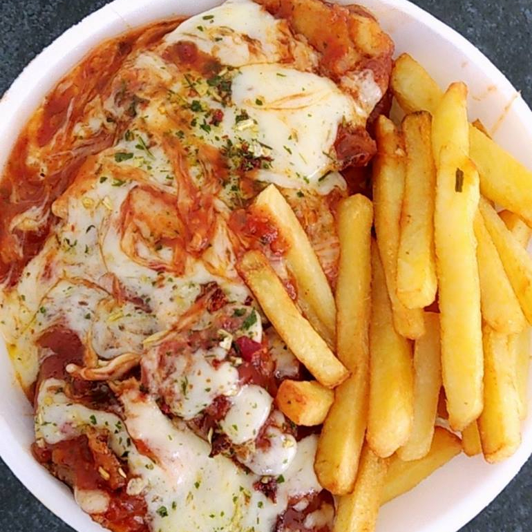 Isca De Frango Acebolada Com Fatias De Bacon Mussarela