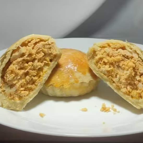 Torta de frango com uma camada finíssima e bastante recheio de peito de frango desfiado e bem temperado.