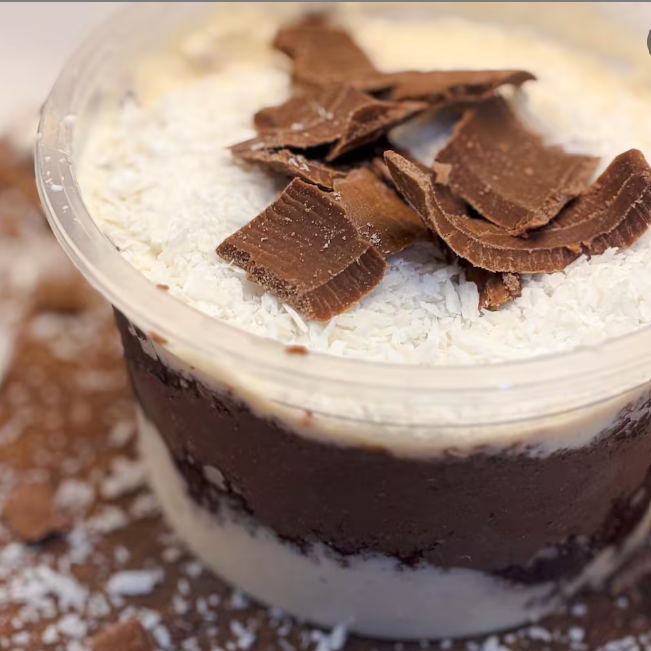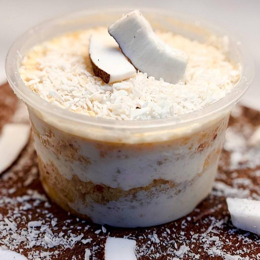 Com camadas suaves de bolo branco macio, enriquecido com o sabor doce do brigadeiro de coco, coberto com coco ralado. Ideal para quem aprecia um sabor refrescante após uma deliciosa refeição. Experimente e apaixone-se!