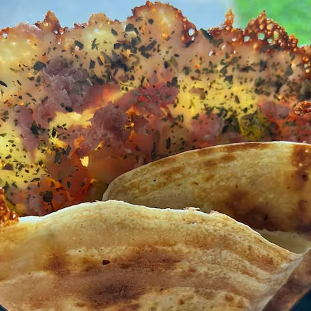 Muçarela, costela desfiada, pimenta biquinho, cebola roxa, molho barbecue e cebola crispy.