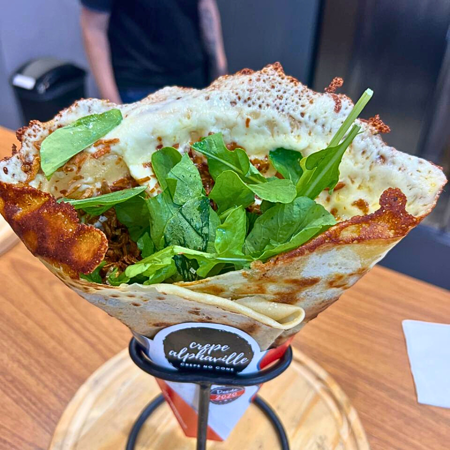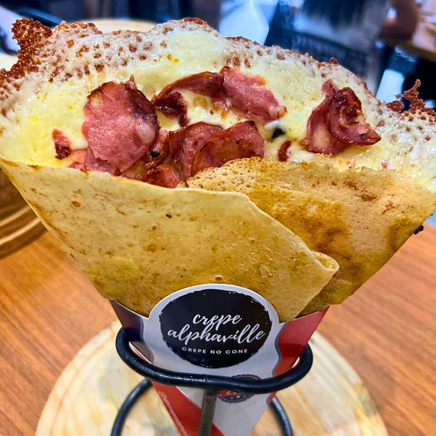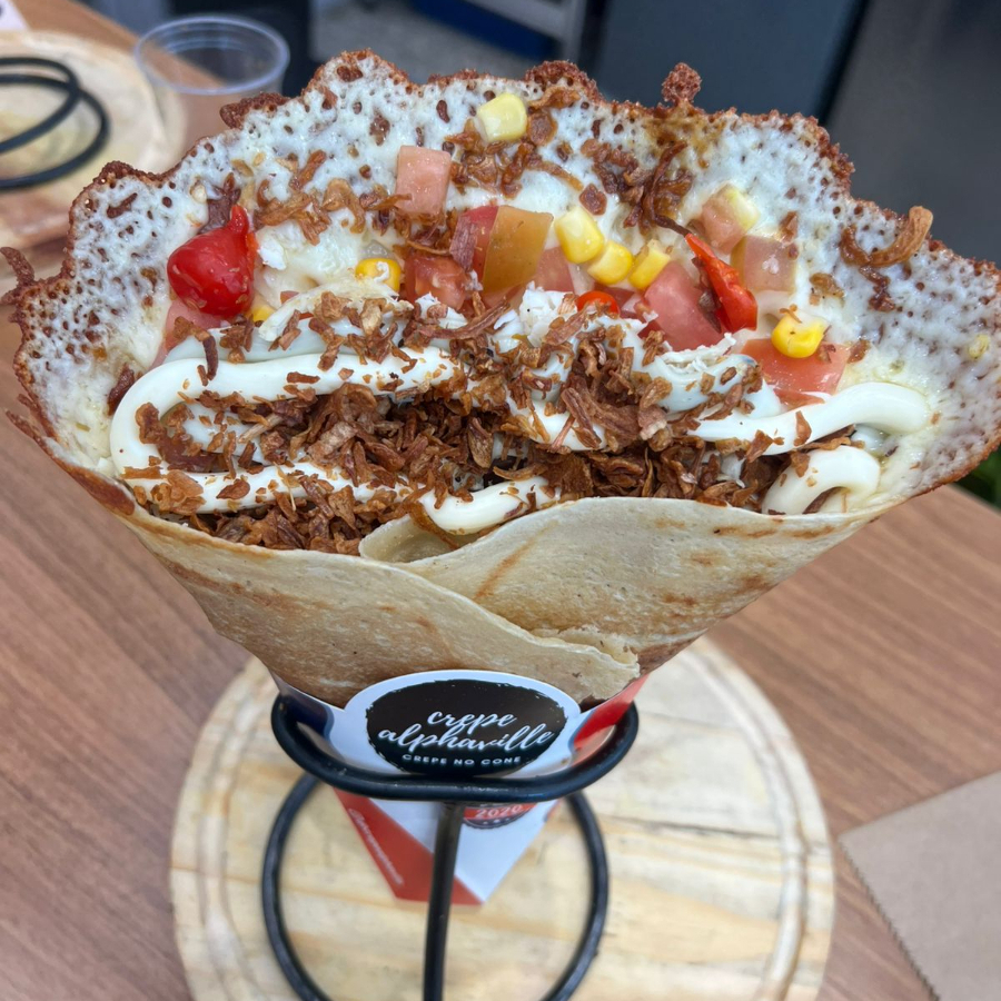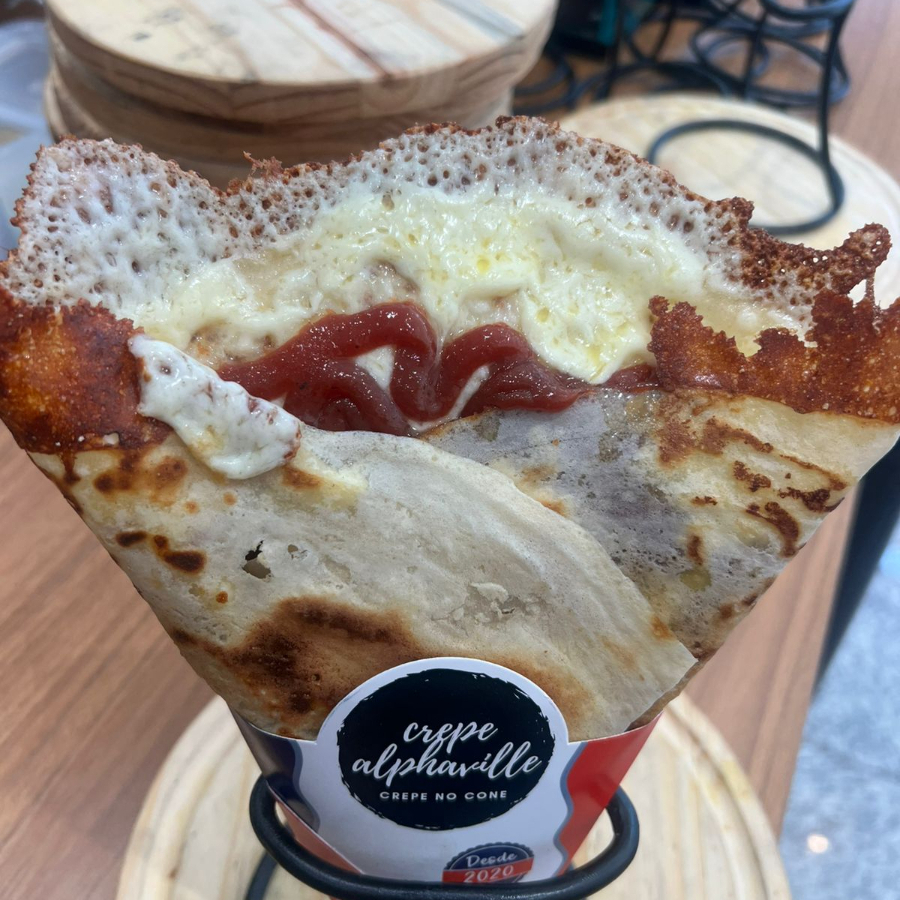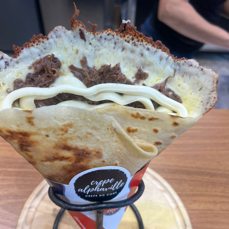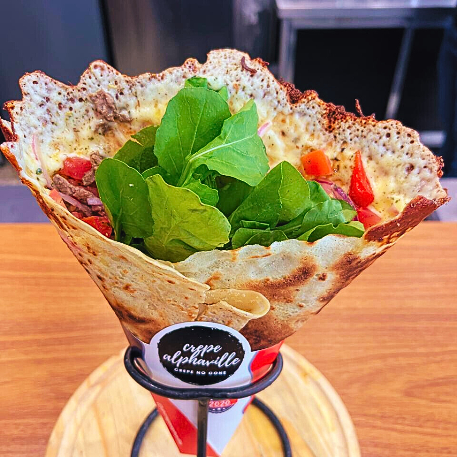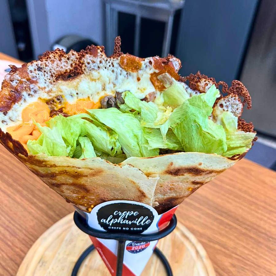 Crepe no cone recheado de filet mignon, mussarela, Catupiry e gorgonzola.