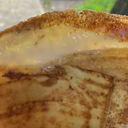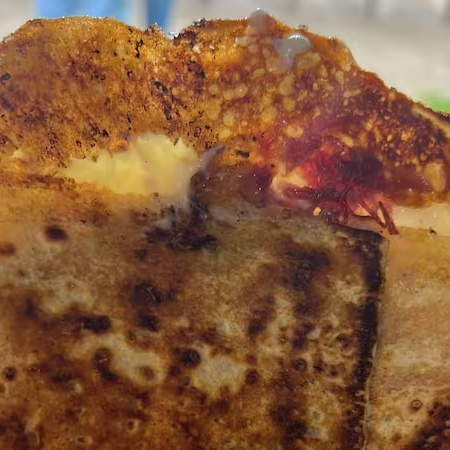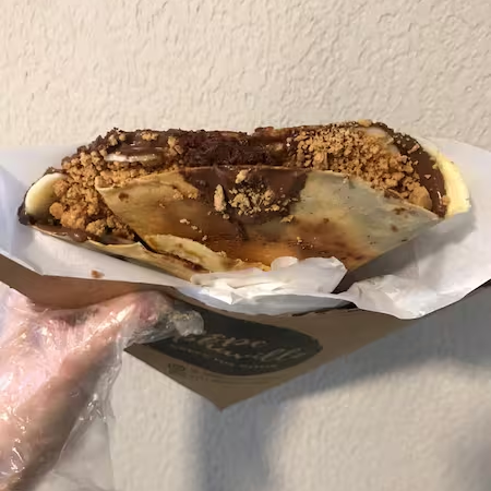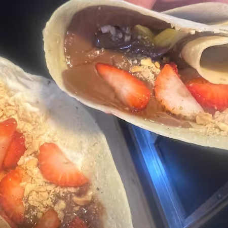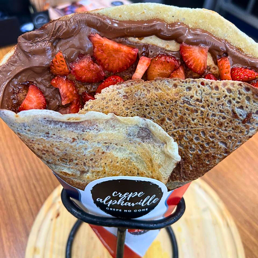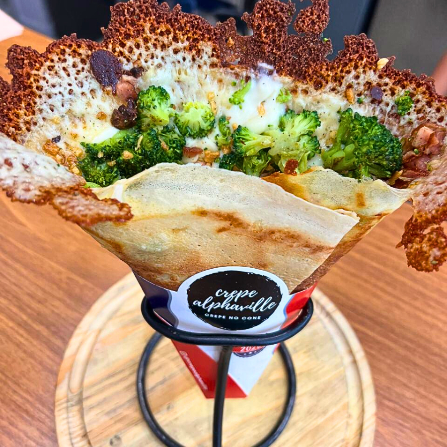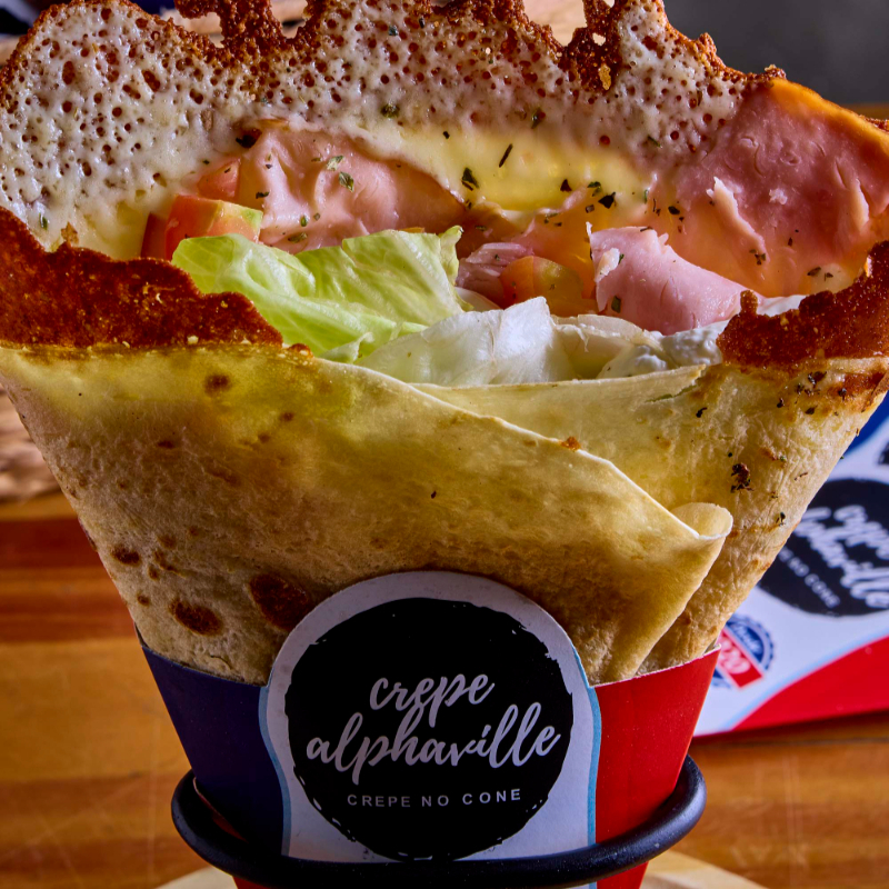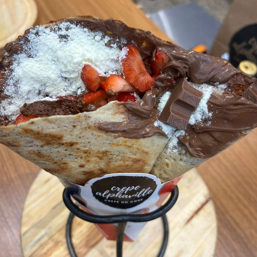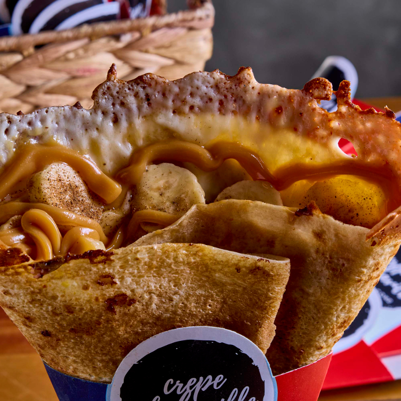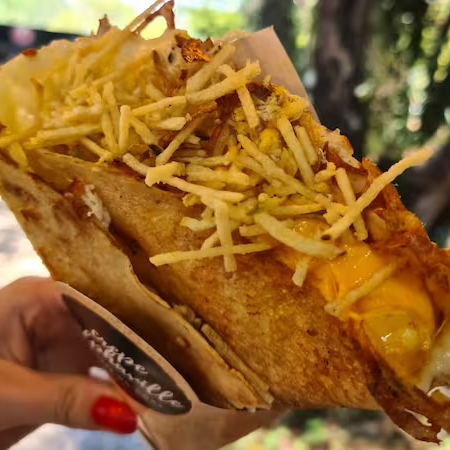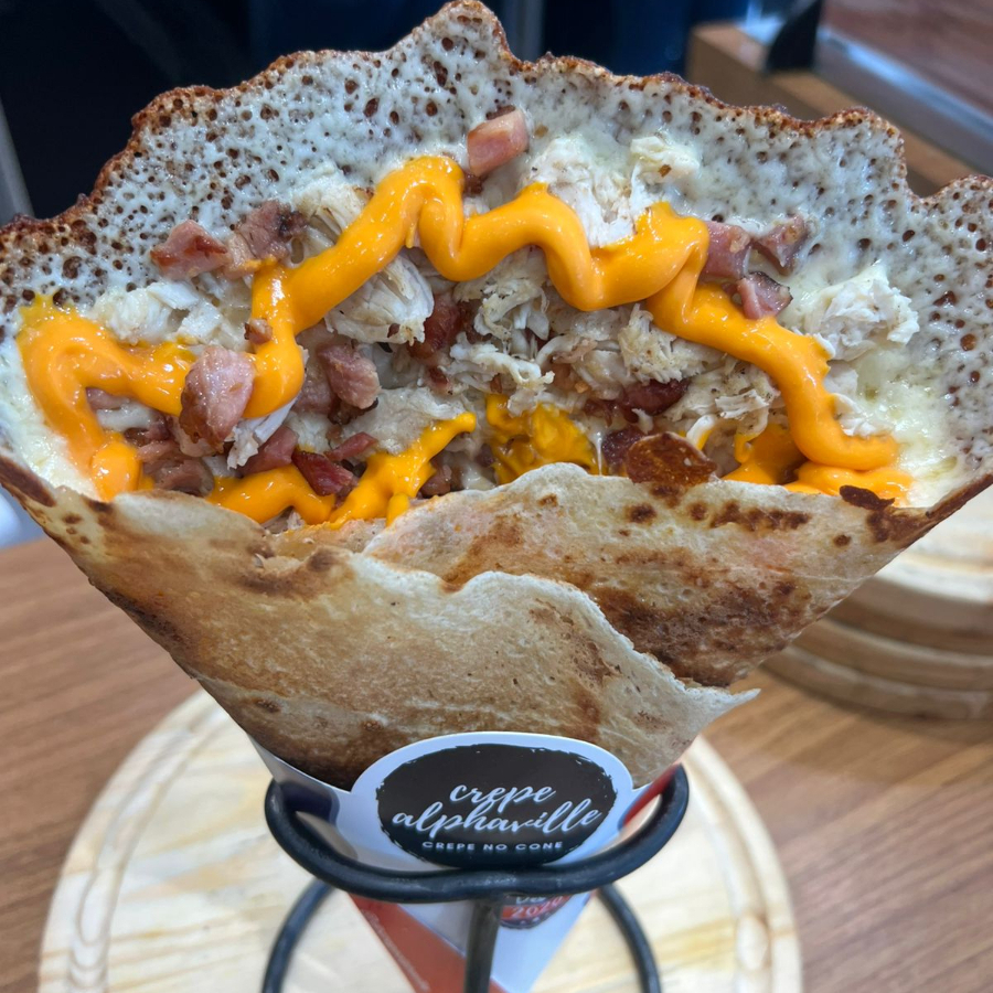 Crepe no cone recheado de filet mignon, mussarela, Catupiry e gorgonzola.