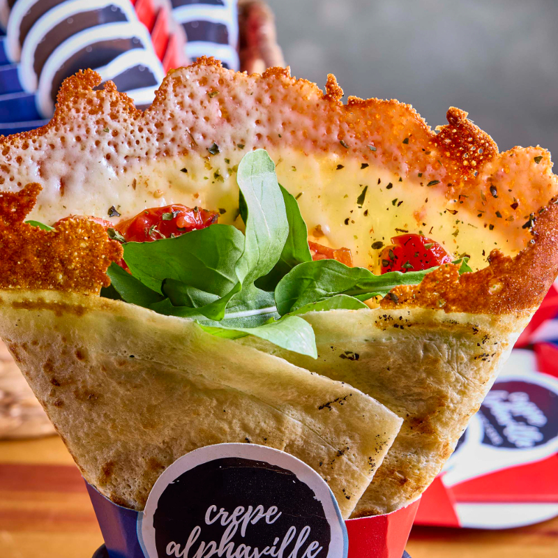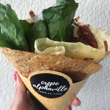 Crepe no cone recheado de queijo, cenoura, tomate, orégno, azeitona e manjericão. *produto para consumo imediato.