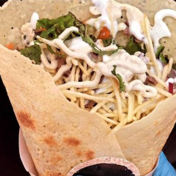 Crepe no cone recheado de frango desfiado, queijo, tomate, cenoura ralada e rúcula.