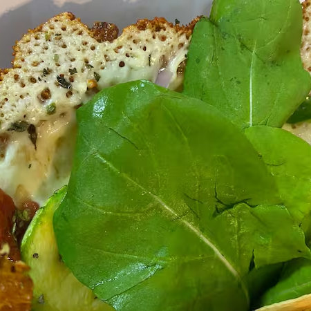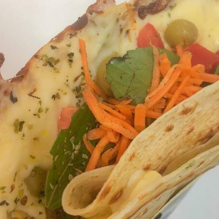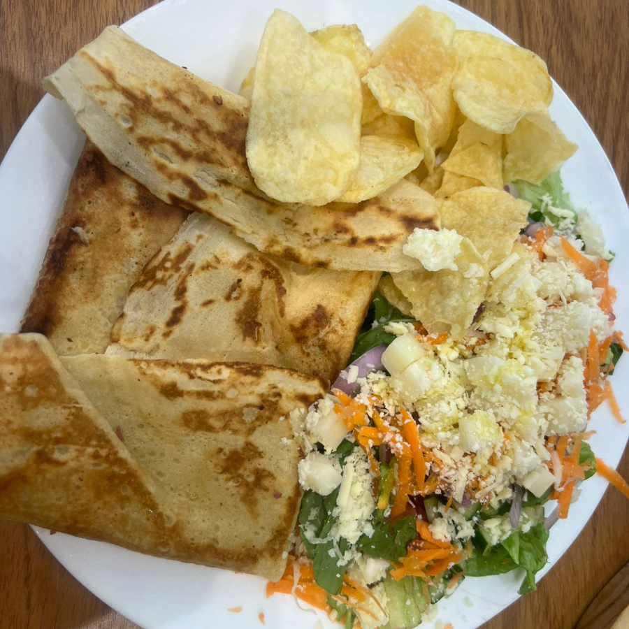 Crepioca recheada com frango, muçarela e requeijão + salada com: alface, rúcula, tomate, cebola roxa, palmito, parmesão e molho de salada.