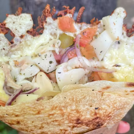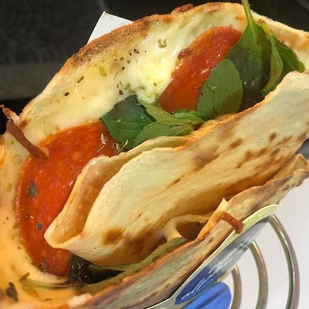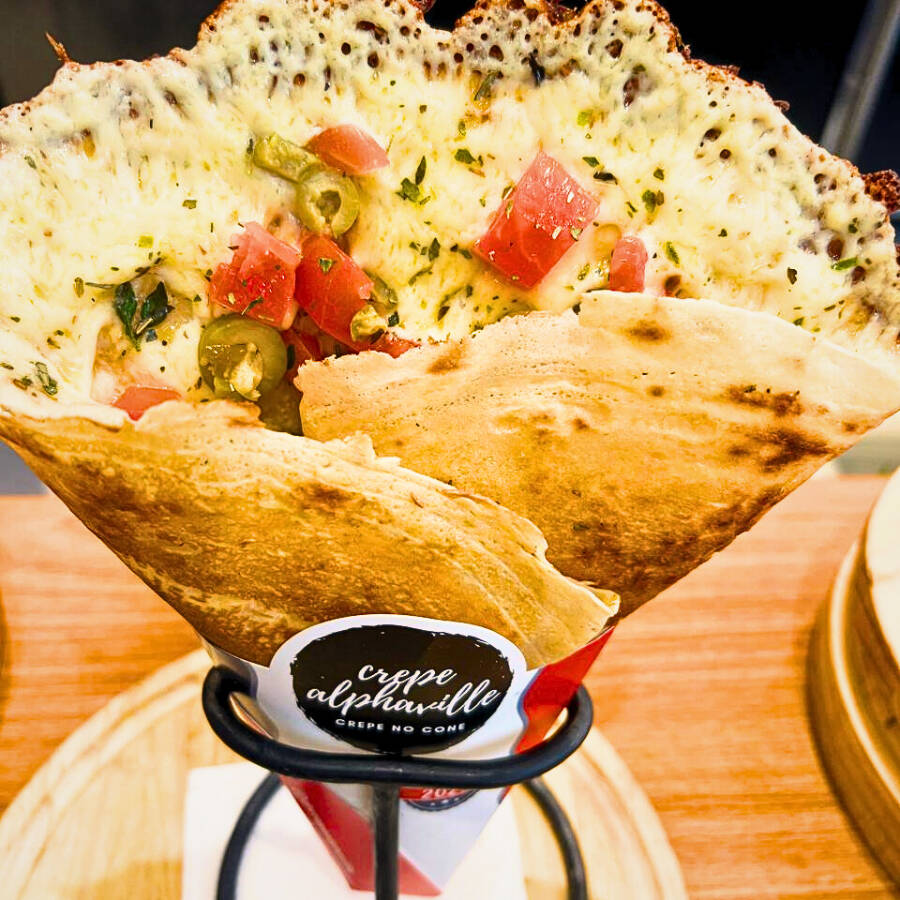 Crepe no cone recheado de queijo, tomate, orégano, azeitona e manjericão.