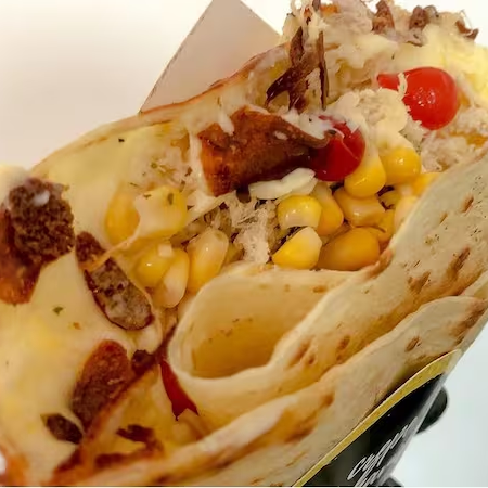 Frango desfiado, Molho de tahine, molho de alho, alface americana, pepino, tomate, cebola roxa, hortelã, cenoura ralada e batata palha.