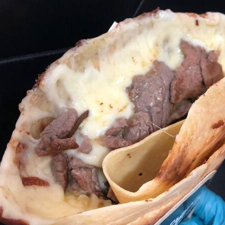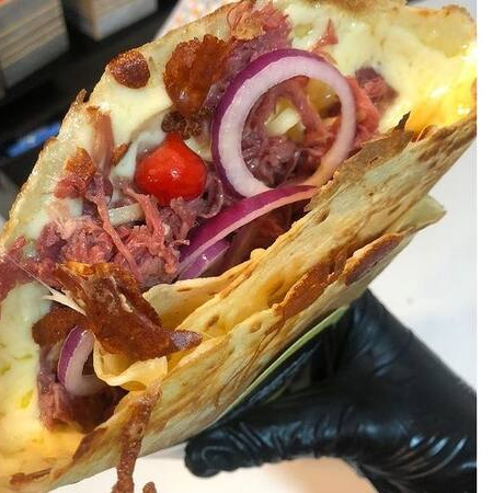 Filet mignon, muçarela, bacon, Doritos, cebola caramelizada.