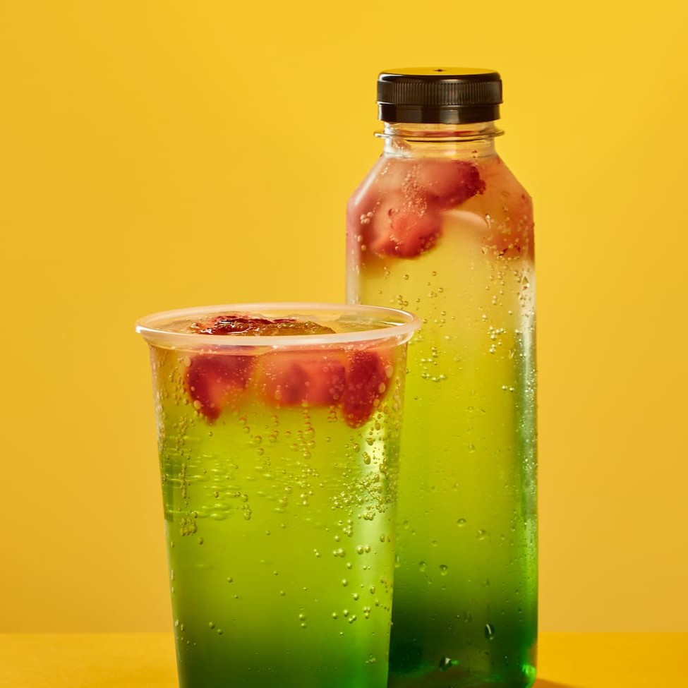 Xarope maça verde especial com suco de maça verde congelado (em temperatura especial) gelo de frutas (morango e amora) e finalizado com água com gás crystal.