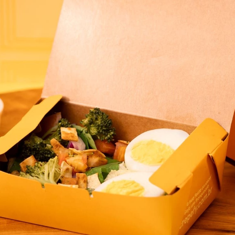 Mix de folhas frescas com tomates, palmito e cebola roxa finamente fatiados, brócolis refogado no azeite extra virgem, cebola roxa, mussarela em cubos, ovos cozidos fatiados e deliciosos Croutons de crepe.