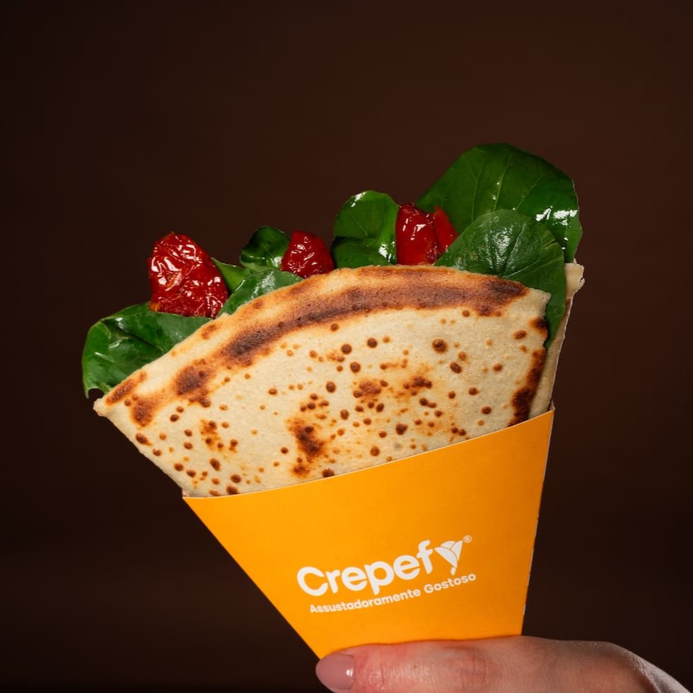Crepe recheado com Rúcula fresca selecionada, Catupiry (Original), finalizado com tomate seco. Esse crepe serve uma pessoa. Geralmente, nossos clientes comem de 2 salgados, 1 doce + 1 bebida e ficam extremamente satisfeitos.