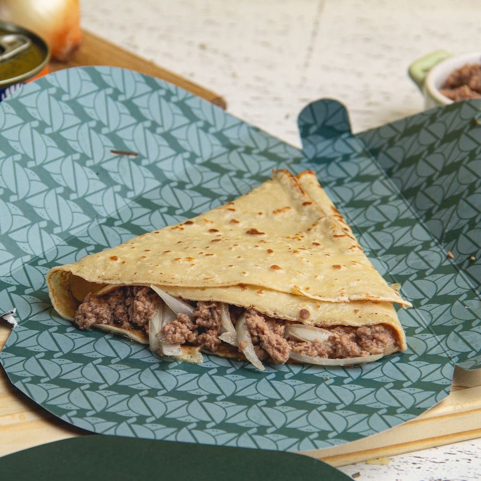 Crepe recheado com Carne seca desfiada, temperado com especiarias, acrescido de tomate, Cebola, Pimenta biquinho e Catupiry (Original).