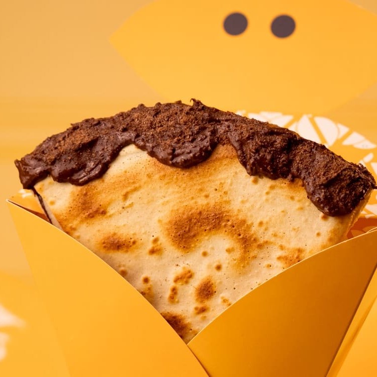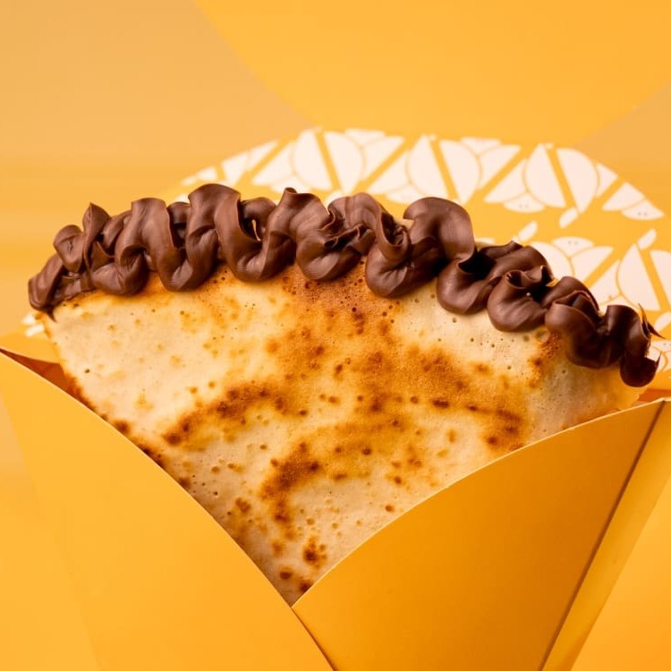 Crepe recheado com uma porção generosa de chocolate ao leite e suculentos Pedaços de chocolate Suflair (Original) envolvidos em uma massa fininha e crocante.